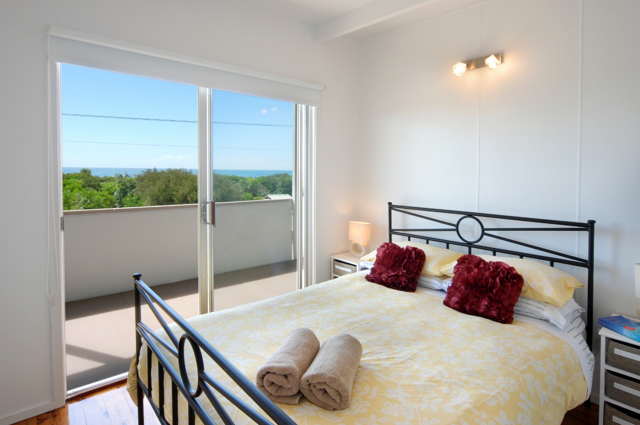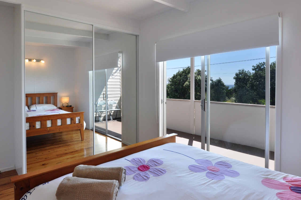 - Main queen bedroom with built-ins and sliding doors onto the front deck