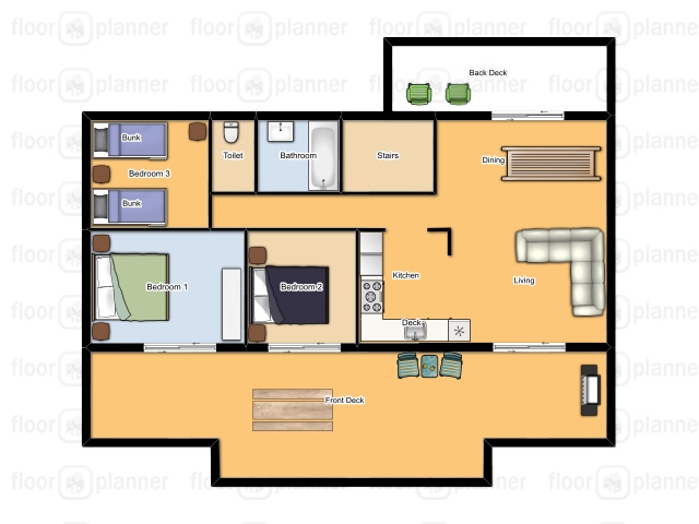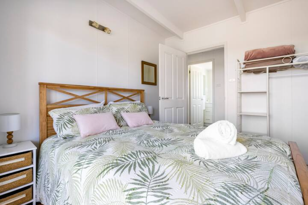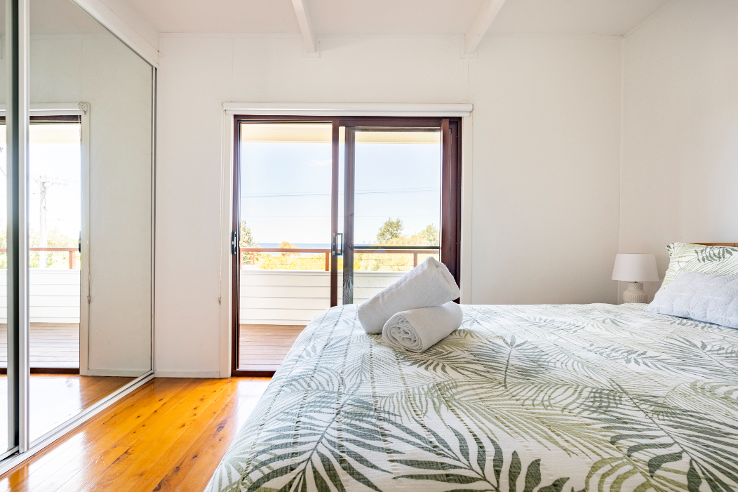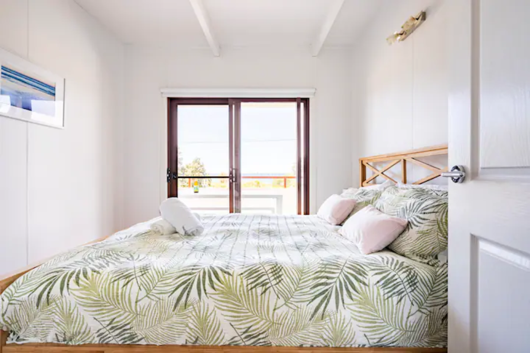 Master Bedroom with queen bed, built in wardrobe and doors leading out to front deck